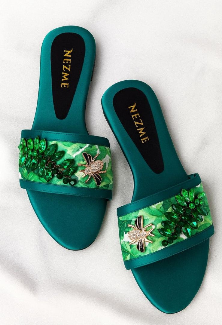 The Emerald Bloom Slides are crafted with satin silk in a striking emerald-green finish. Designed with a vibrant tropical print and delicate embellishments to bring together elegance, comfort, and modern style.