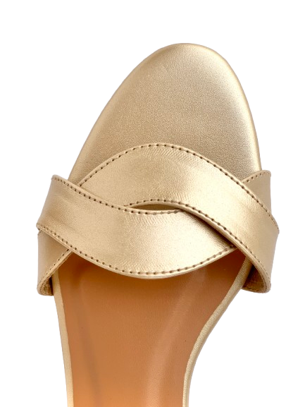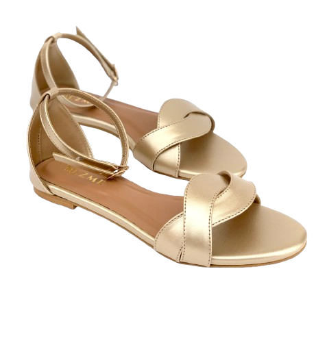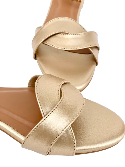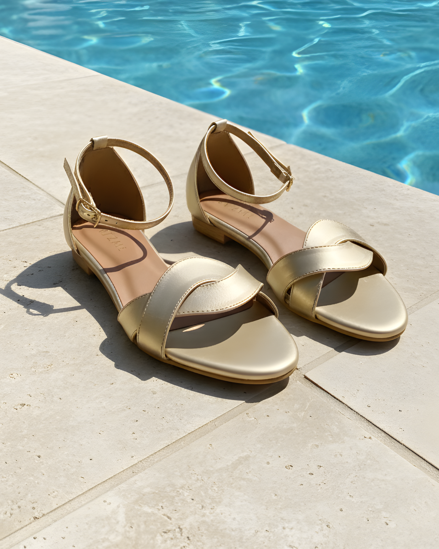 Luna sandals in soft gold, crafted for effortless elegance. Featuring a sleek ankle strap and a twisted front detail, these sandals bring just the right amount of shine to elevate your everyday style.