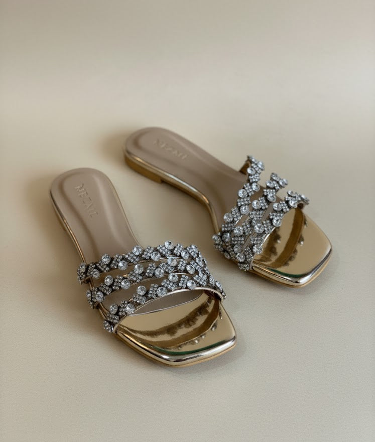 Solène - a pair of elegant gold slides crafted for comfort and style. Featuring exquisite hand-embellished details, these slides add a touch of glamour to any look—perfect for effortless chic and all-day wear.